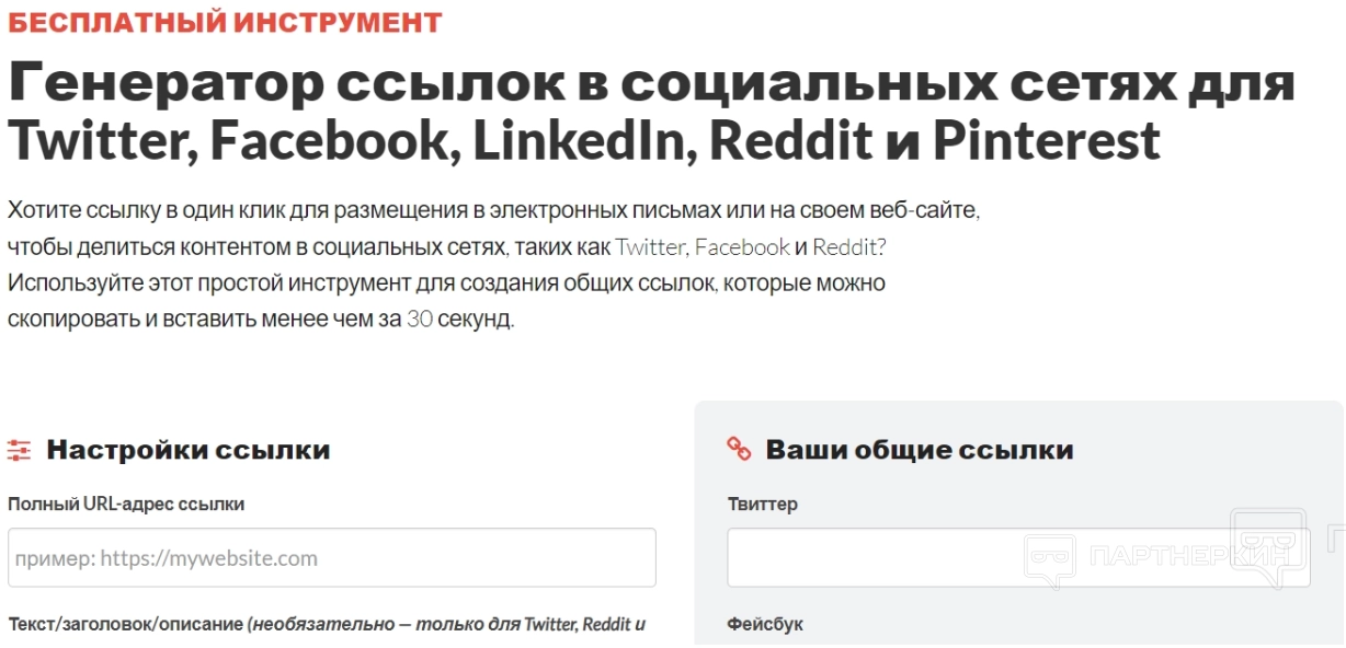 - Генератор ссылок для обмена в социальных сетях — с помощью генератора можно создать одну единственную ссылку, которую можно будет размещать на сайте или в электронных письма для быстрого перехода в социальные сети бренда. Чтобы найти инструмент, нужно переходить в предыдущий, так как если перейти по указанной ссылке, пользователь попадет в блог.