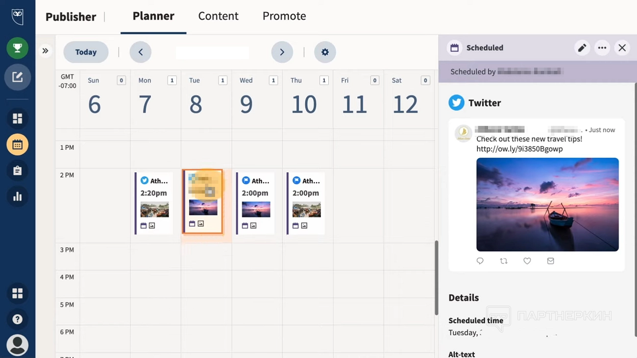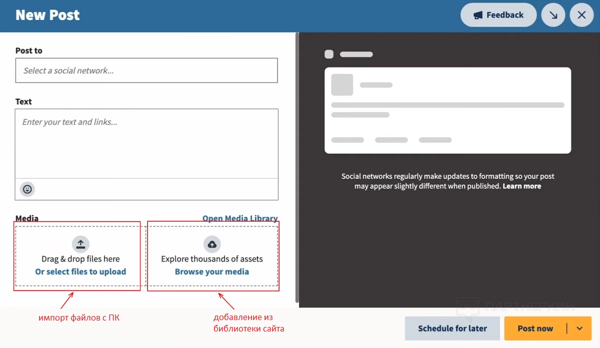 Сбоку справа показывается превью того, как пост будет выглядеть после публикации. Чтобы отправить сообщение сразу, кликните Post now. Чтобы запланировать публикацию на другую дату, щелкните Schedule for later. Выберите дату и время и нажмите Done. Запланированные записи можно отследить в разделе Publisher.