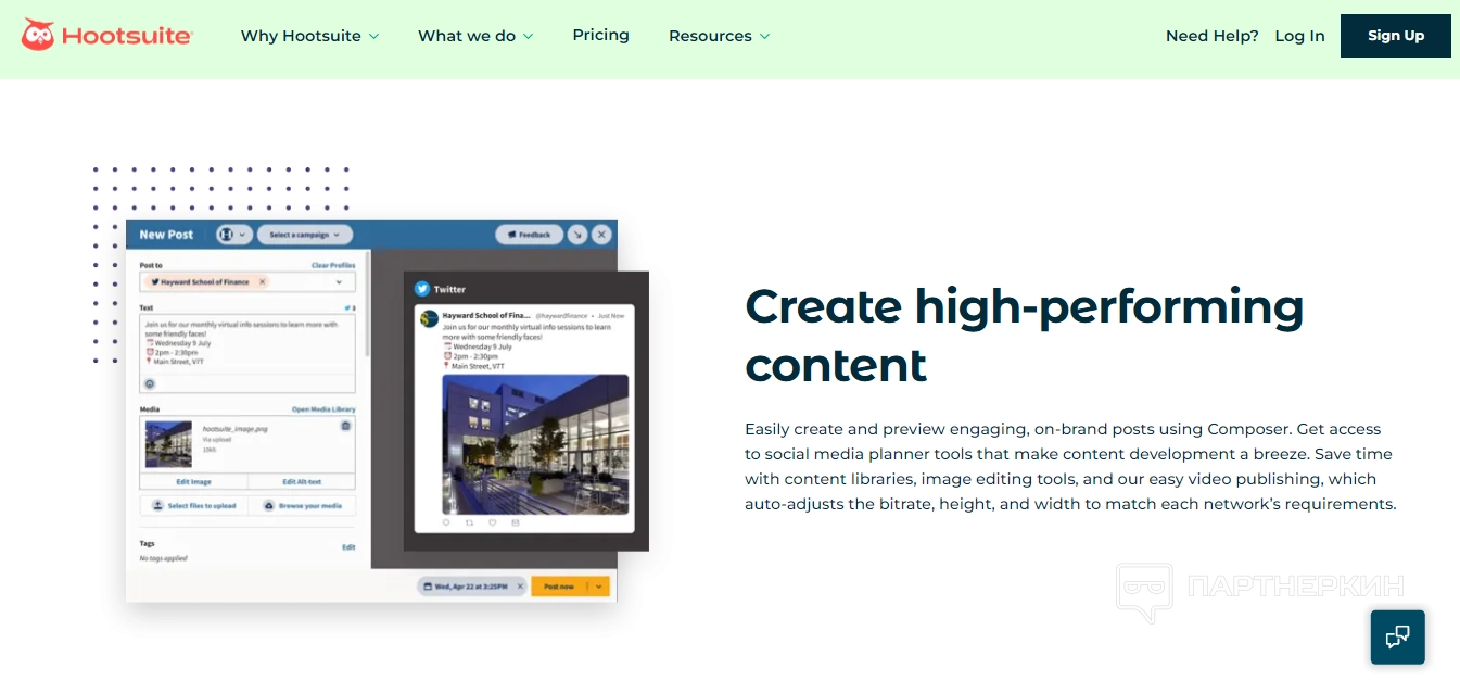 Пользователям разрешается загружать собственные медиафайлы, редактировать фотографии, улучшать качество видеороликов. Инструмент помогает подгонять контент под единый фирменный стиль. Имеется возможность создавать и публиковать несколько постов одновременно и оптимизировать публикации для разных социальных сетей.