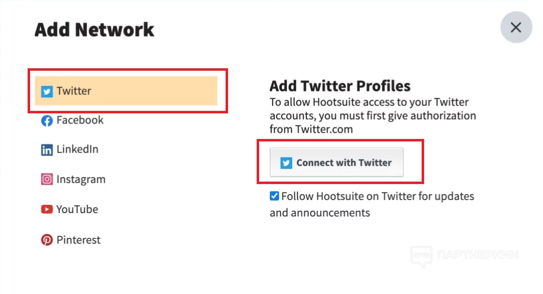 Первым шагом становится привязка социальных аккаунтов. Для этого кликните по кнопке Get Started и в появившемся окошке кликните по пункту Add Social Network. Войдите на сайт через нужную сеть, открыв соответствующую вкладку. Сервис поддерживает подключение Facebook*. Twitter, Instagram*, LinkedIn, YouTube, Pinterest, TikTok.