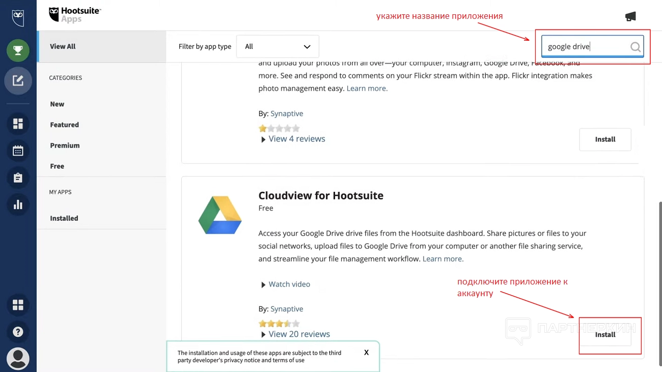 Перейдите в раздел Free (Premium приложения доступны только в бизнес-тарифах) и подберите подходящую интеграцию. Можно проводить поиск по библиотеке, введя название в поисковую строку.Для добавления нужного приложения кликните Install и следуйте подсказкам сайта.