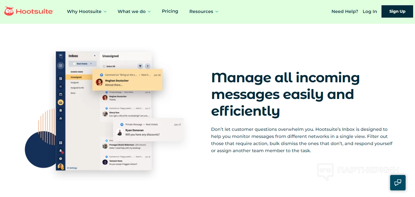 Сервис собирает входящие сообщения, комментарии и упоминания со всех аккаунтов в единой панели. Разрешается отфильтровывать их относительно важности, помечать прочитанными, отвечать самому или перенаправлять другим членам команды. Опция создания ответов-шаблонов и интеграция чат-ботов позволяет ускорить время отклика.