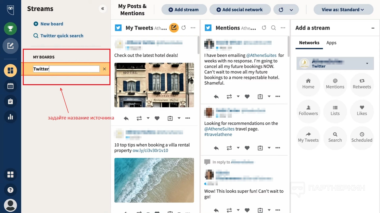 В окошке привязанных сетей кликните Next, чтобы подтвердить выбор. После этого на главной странице аккаунта появится новостная лента из привязанной соцсети. Если вы намерены подключить несколько аккаунтов, рекомендуется задать название, чтобы быстрее сортировать источники. Для этого сбоку под пунктом My Boards введите название стрима.