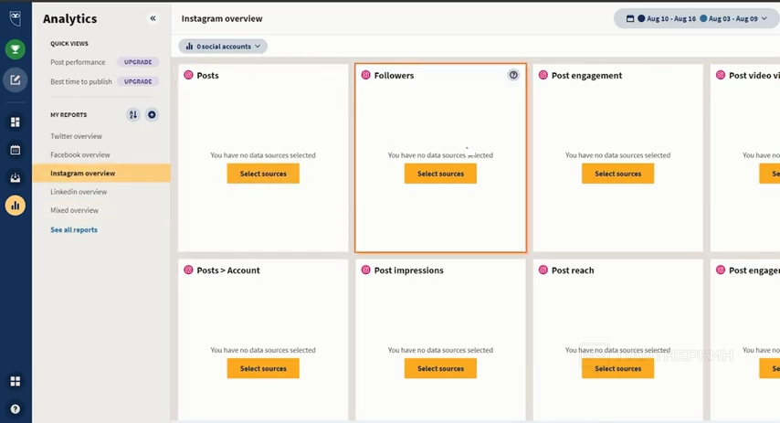 Сервис позволяет отслеживать показатели по всем подключенным сетям одновременно или выбирать отдельные аккаунты. Для подключения аккаунта нужно нажать Select sources.