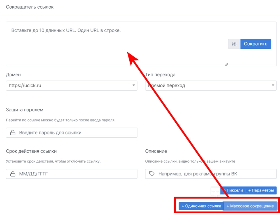 Вы можете добавлять ссылки по одной или списком. При выборе второго варианта будет представлено расширенное окно, где вы сможете вписать 10 URL-адресов столбиком.