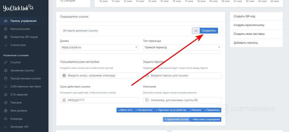 После того, как вы завершите все необходимые настройки, нажмите кнопку «Сократить». Короткая ссылка будет создана и отображена в вашем кабинете. Также она появится во всех разделах статистики. Там вы сможете отслеживать активность и эффективность всех созданных URL.