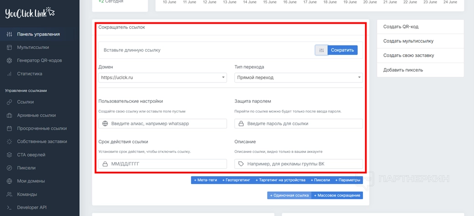 Инструмент для создания короткого URL находится в разделе «Панели». После регистрации функционал сервиса расширяется. Появляются дополнительные инструменты.