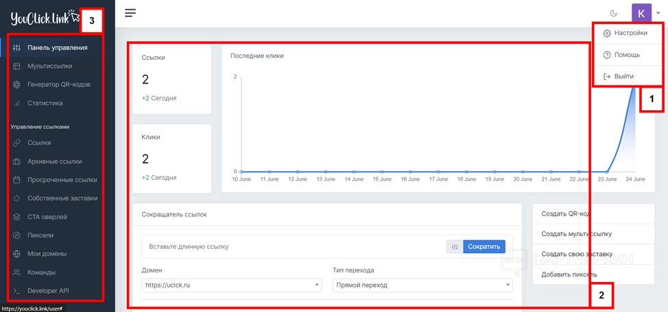 - Панель управления. Здесь вы найдете основную информацию о своем профиле, список последних созданных ссылок и графики, отображающие активность переходов. Также в панели управления можно создавать короткие ссылки.