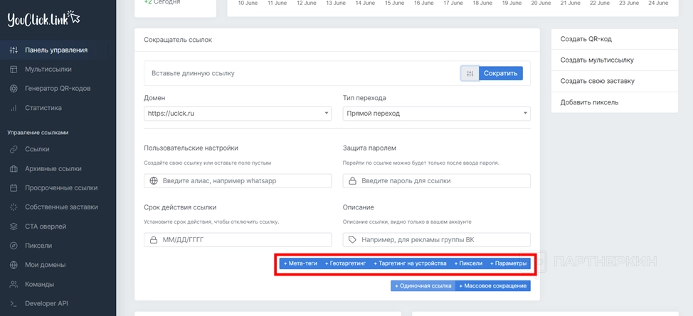 Некоторые из доступных настроек включают SEO-инструменты, геолокацию, перенаправление для мобильных устройств, сегментирование по языкам, таргетинг по пикселям, установку даты истечения работы ссылки (временные ссылки), A/B-тестирование и UTM-метки.