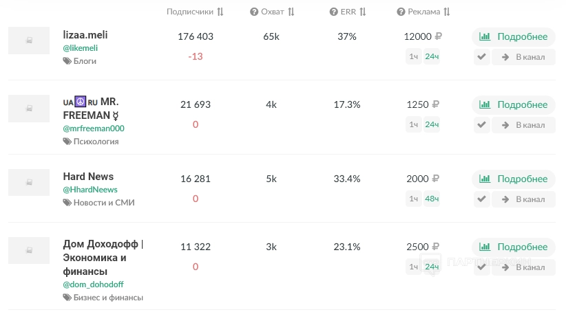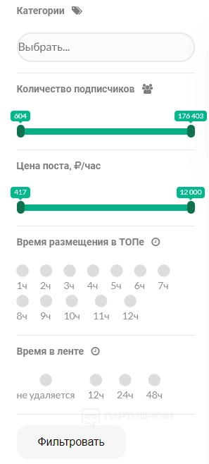 - стоимость рекламного поста (от 1 до 12 часов);