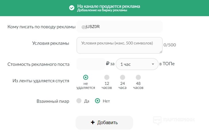 - условия рекламы (расписать условия до 500 символов);