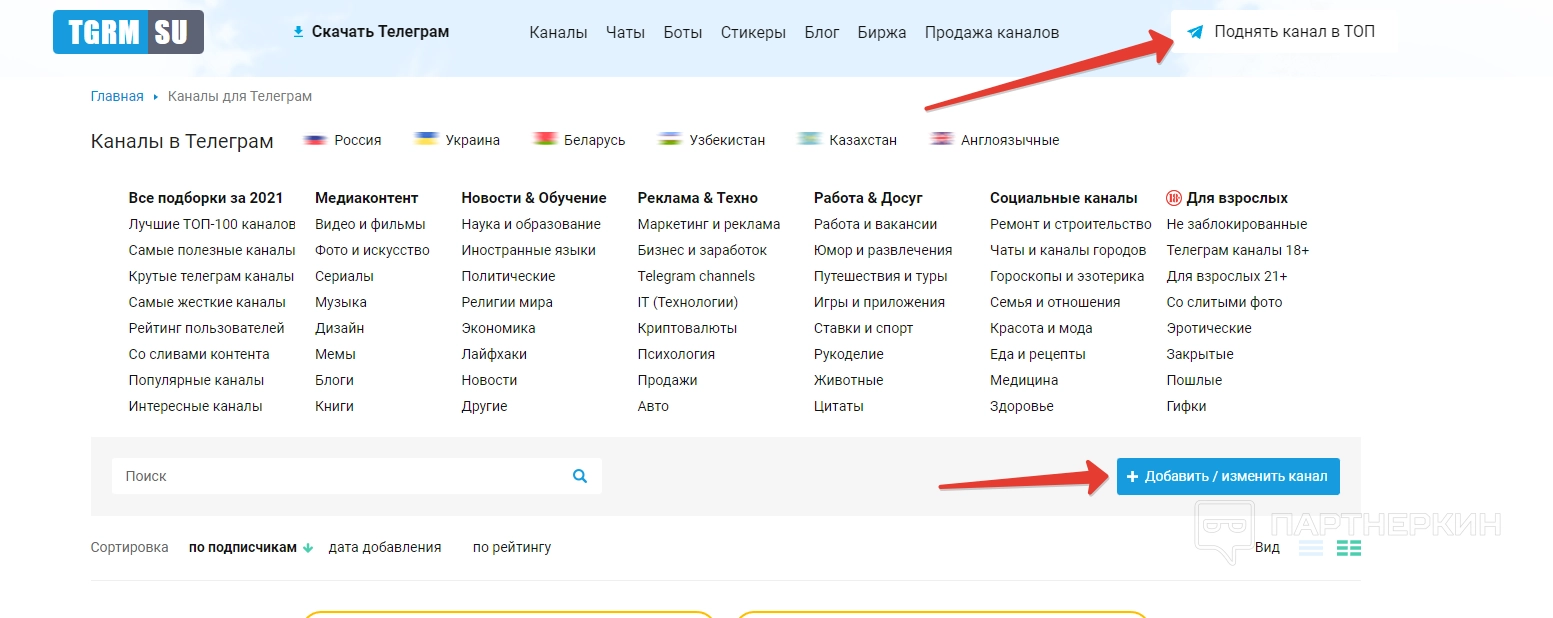 Однако есть один нюанс. Чтобы добавить свой канал в каталог биржи, вебмастеру придется воспользоваться своим Telegram-аккаунтом. В первую очередь открываем стартовую страницу сайта и жмем «Добавить/изменить канал» или «Поднять канал в ТОП».