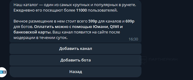 Жмем на «Добавить канал/бота» и видим форму со стоимостью размещения в бирже. На момент написания статьи цена за размещение каналов и ботов была 599 руб. и 699 руб. соответственно.