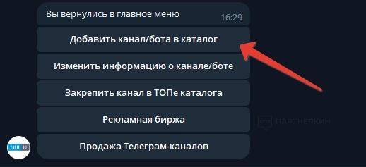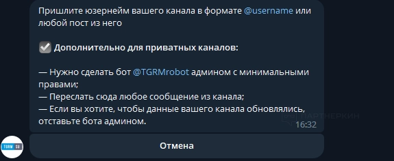 Когда пользователь выберет, например, «Добавить канал», останется только указать ссылку на канал, выдать боту права администратора и переслать сообщение из канала.