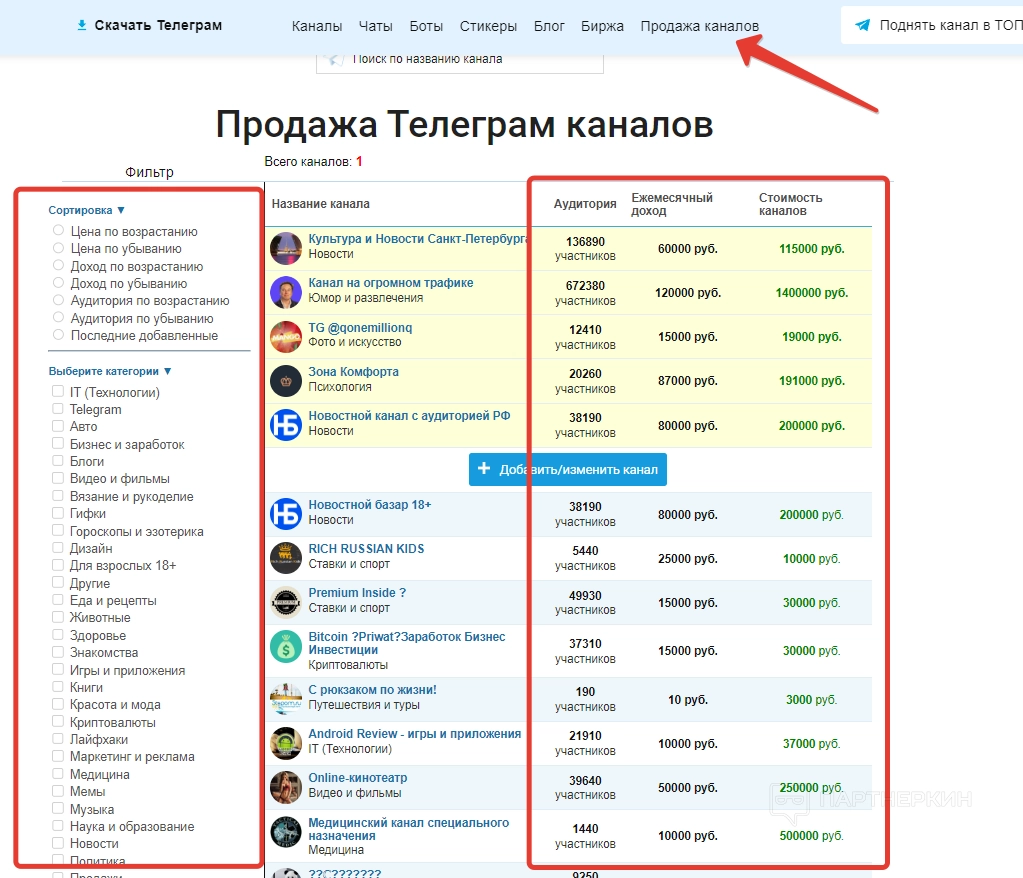 Если пользователь хочет приобрести канал, следует вернуться на стартовую страницу биржи и выбирать вкладку «Продажа каналов». Тут же откроется страница, где отобразиться перечень доступных к продаже каналов. Для более удобного поиска предусмотрена поисковая строка и система фильтрации, сортирующая каналы по: