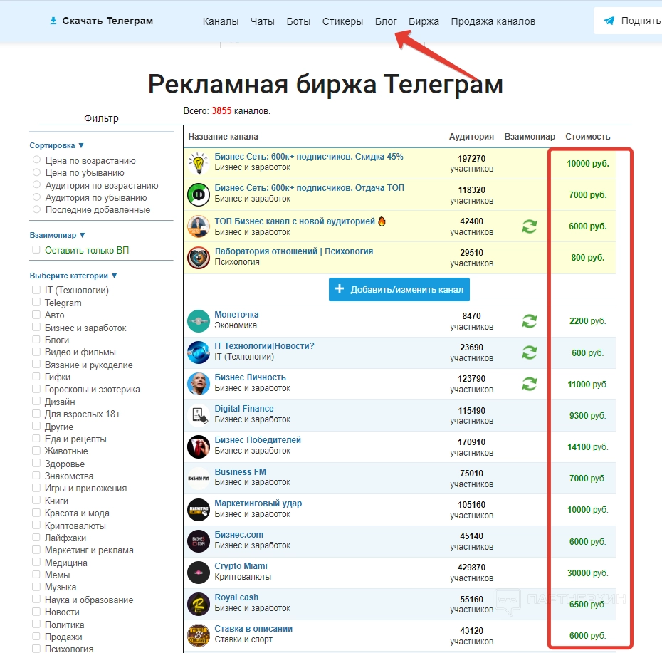 Для покупки рекламы следует перейти в раздел «Биржа». Здесь отображается перечень каналов, в которых можно приобрести рекламную интеграцию. В разделе предусмотрена та же система фильтрации и таблица с параметрами каналов. Стоимость интеграции можно найти в правой колонке.