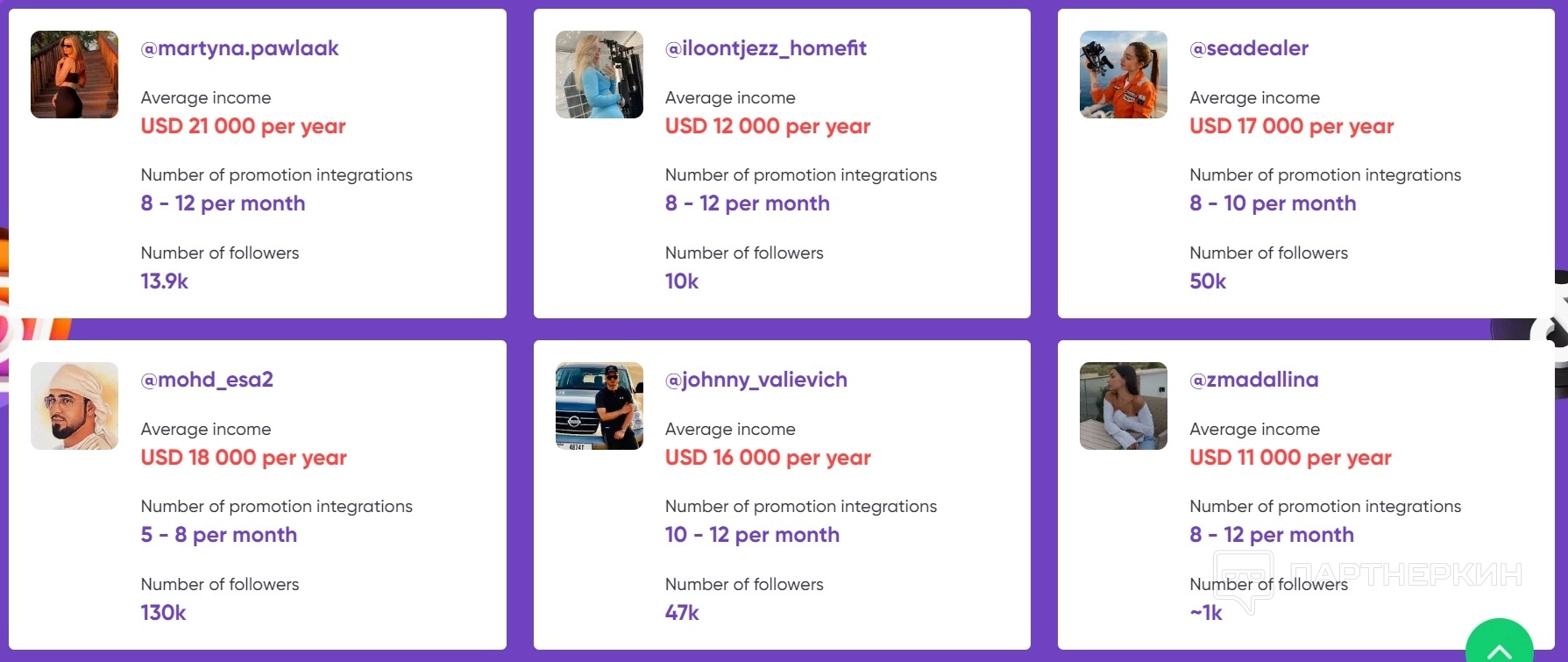Сервис работает с 25 900 блогерами по всему миру. По каждому блогеру для ускорения выбора на главной странице выводятся главные сведения: никнейм, тема аккаунта, география, размер аудитории подписчиков, аватара или логотип. Можно выбрать блогеров с тематическими аккаунтами: бизнес и финансы, красота и здоровье, обзоры товаров, мода и дизайн.