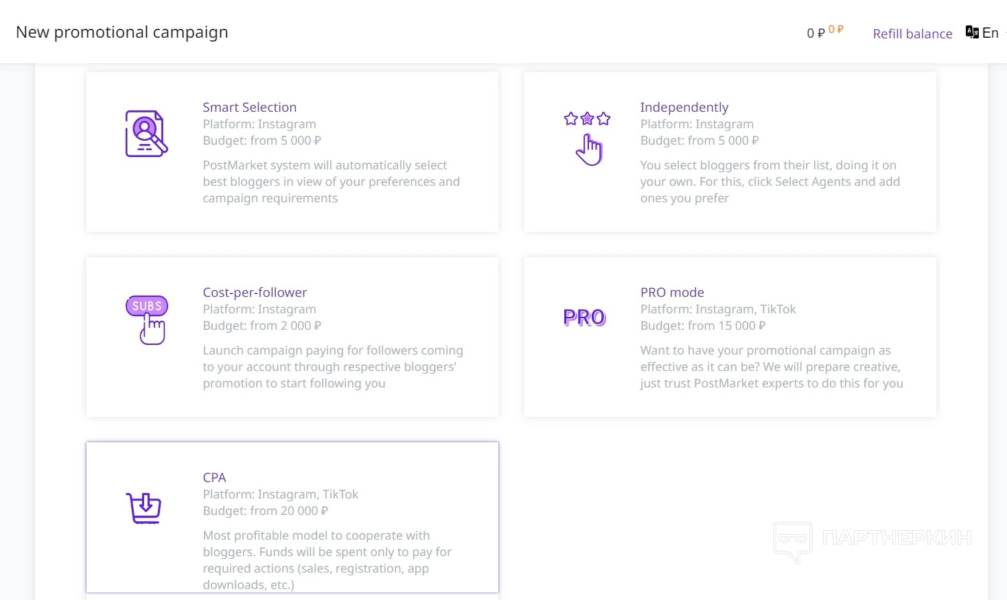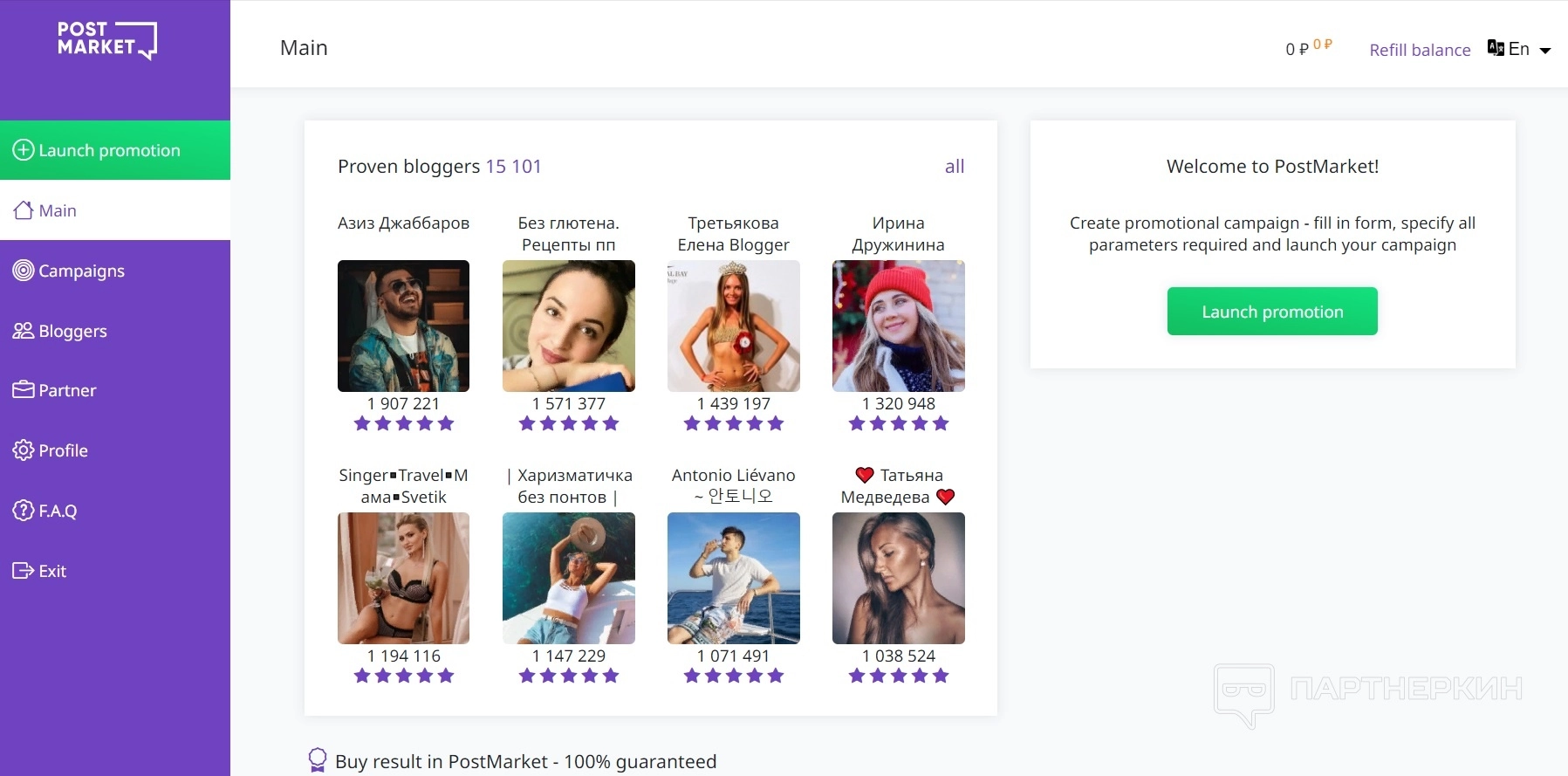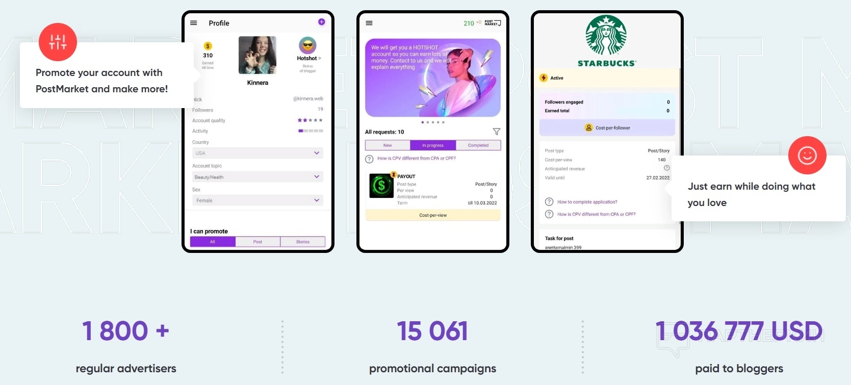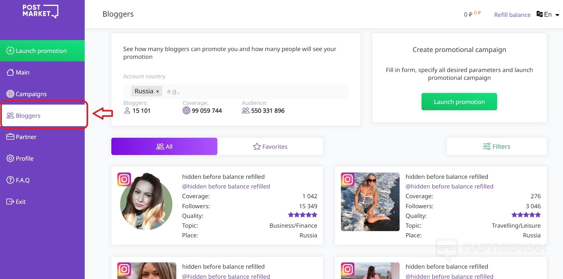 Postmarket.proорганизовывают кампанию через блогера под ключ. Сервис подбирает аккаунты согласно требованиям и параметрам, указанным в заявке.