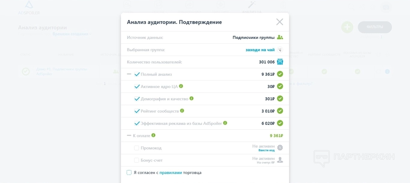 Если пользователь уже приобрел тарифный план и он соответствует запросу (то есть услуга анализа целевой аудитории входит в перечень), то заказ сразу отправится в работу, после чего результаты можно будет просмотреть в той же вкладке или сохранить себе на устройство.