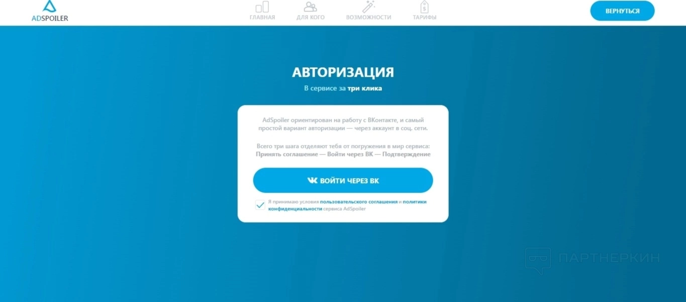 Для работы и доступа к кабинету, пользователю необходимо авторизоваться в сервисе с помощью своего аккаунта в ВКонтакте. Делается это достаточно быстро и просто, необходимо только согласие с условиями и разрешение доступа к учетной записи ВК. Никакого дополнительного подтверждения по почте или заполнения особых персональных данных не нужно.
