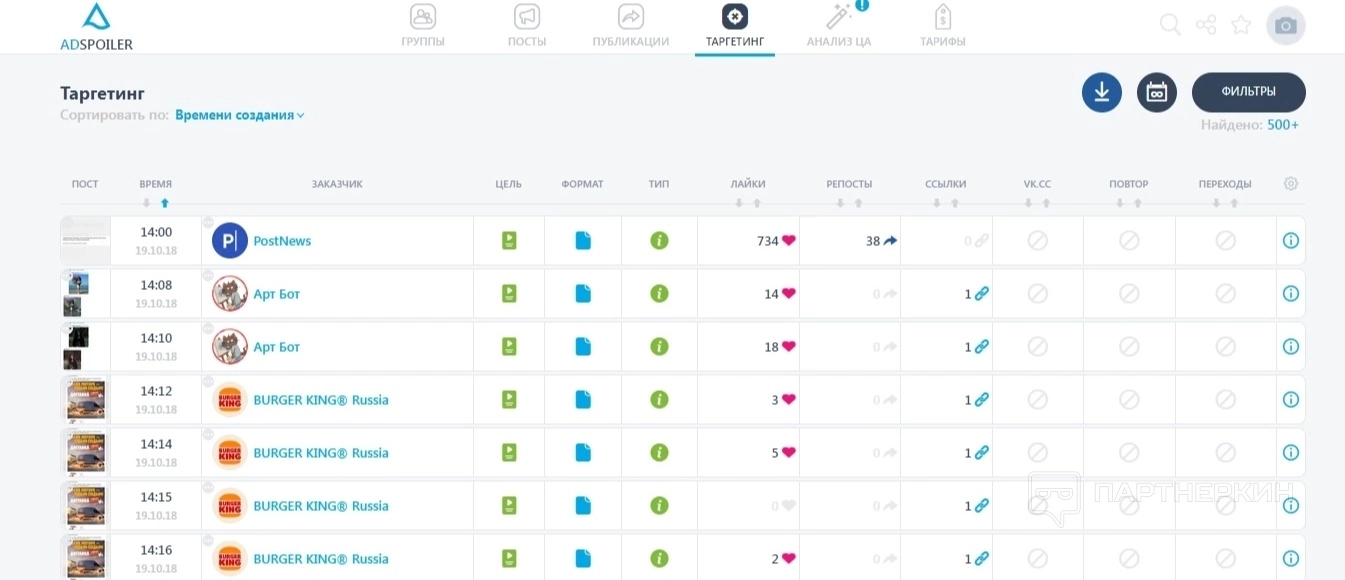 Раздел Таргетинг показывает эффективность тех или иных опубликованных креативов по количеству лайков, репостов, комментариев и другим параметрам.