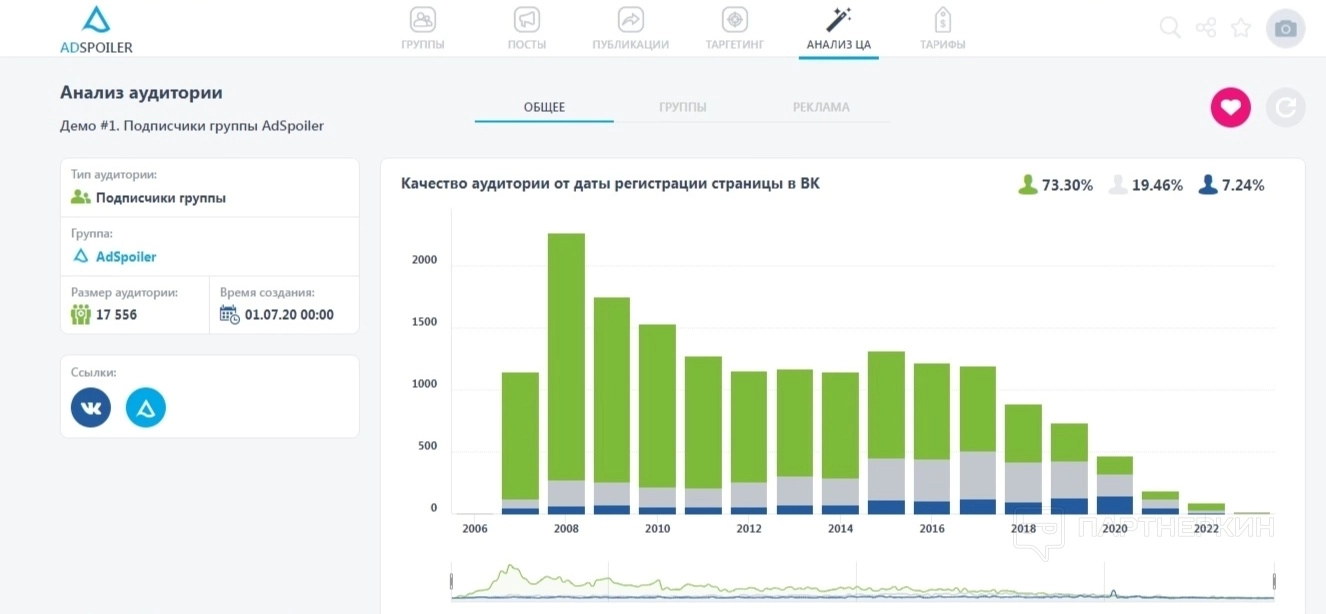 Последний раздел — Анализ целевой аудитории . По умолчанию для примера (демо-просмотр) здесь закреплена группа самого сервиса. Нажимая на нее, пользователь может получить реальную статистику по аудитории группы: живые подписчики, их точное количество, статистику по рекламе и так далее.