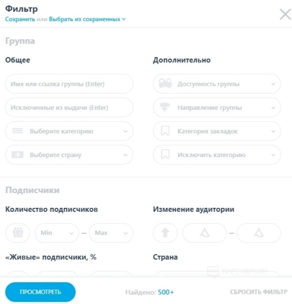 В каждом разделе находятся специальные фильтры, редктируя которые пользователь может сортировать и отсеивать ненужные ему сообщества. Здесь можно настраивать тематику, возраст аудитории, количество подписчиков и другие важные параметры.
