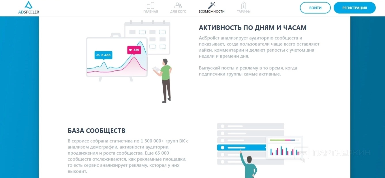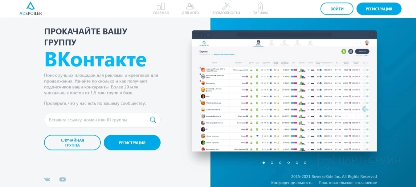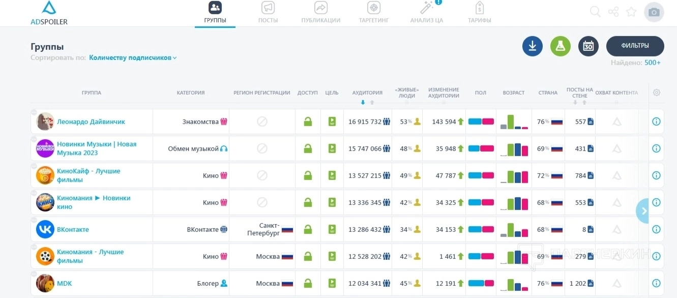 AdSpoilerимеет обширную базу данных с более чем 1 500 000 миллионов групп. Для каждой из них подготовлена специальная статистика с количеством подписчиков, их ГЕО, активностью аудитории и так далее. Часть из представленных сообществ анализируется алгоритмами и как рекламная площадка, на которой в дальнейшем можно публиковать свои предложения.