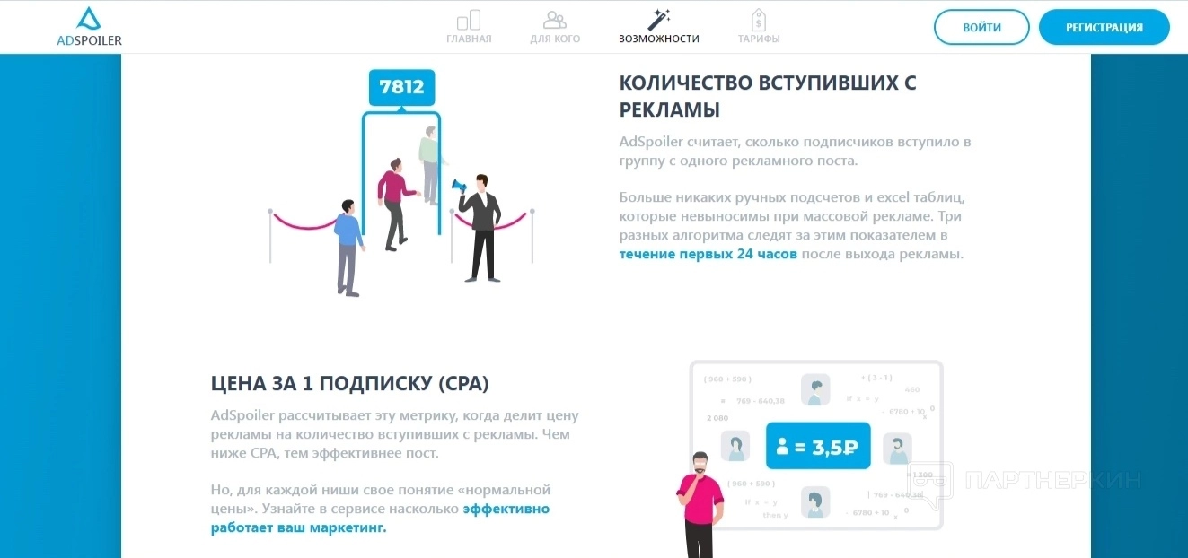 AdSpoilerне просто указывает количество подписчиков на запрашиваемый момент времени, но и отслеживает сколько человек вступило в группу с момента публикации выбранного поста. За это отвечают три специальных алгоритма, которые ведут свою деятельность в течение 24 часов с момента публикации креатива.