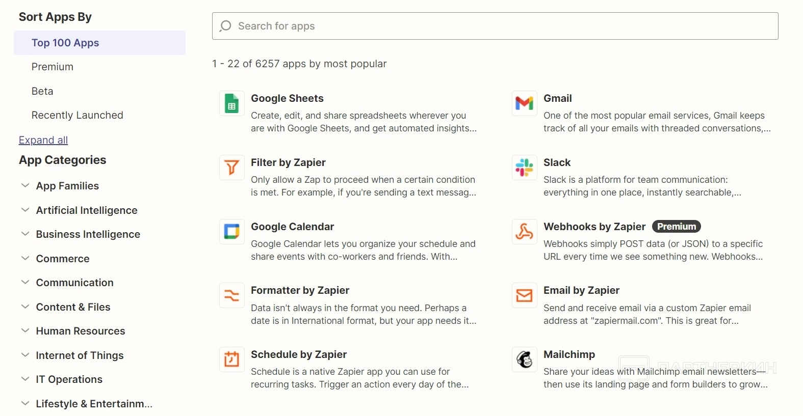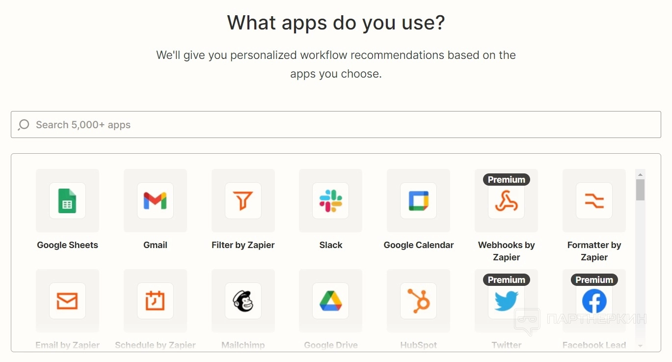 Zapier. Он содержит более 5 000 популярных приложений: Gmail, Slack, Trello, Google Sheets и другие. Есть возможность использовать поиск или посмотреть категории приложений, чтобы найти нужные инструменты.