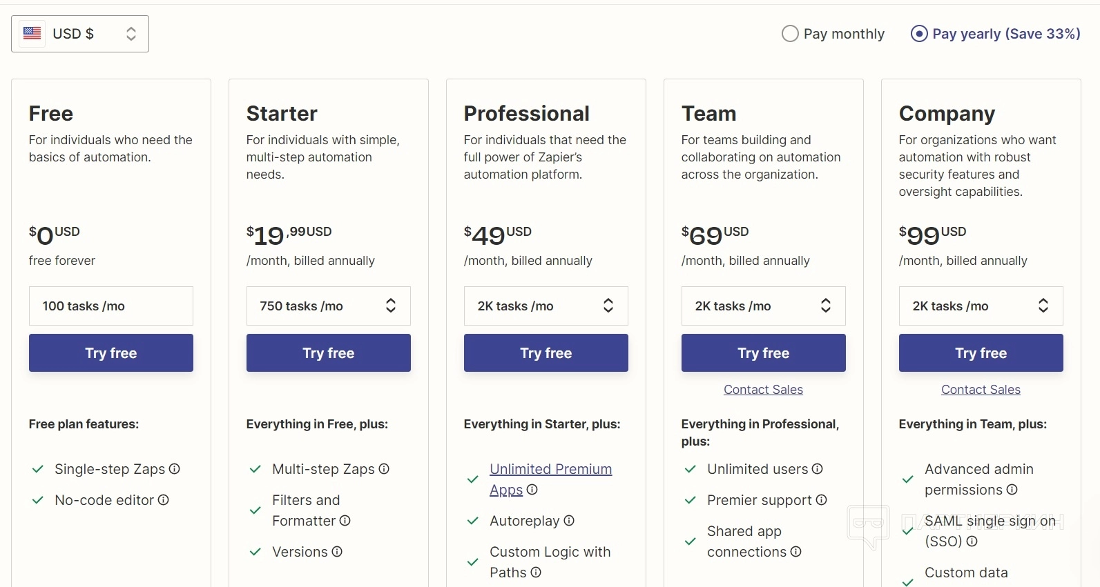 - Компания — от $99 / мес. для неограниченного количества пользователей, до 100 000 задач/мес. и неограниченное количество и тип Zaps.