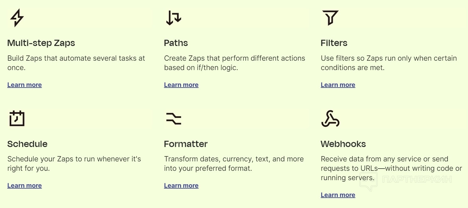 Zapier поддерживает вебхуки, что позволяет взаимодействовать с любыми API-интерфейсами, которые не входят в каталог поддерживаемых приложений. Можно создавать собственные интеграции с помощью вебхуков и взаимодействовать с любыми внешними сервисами.