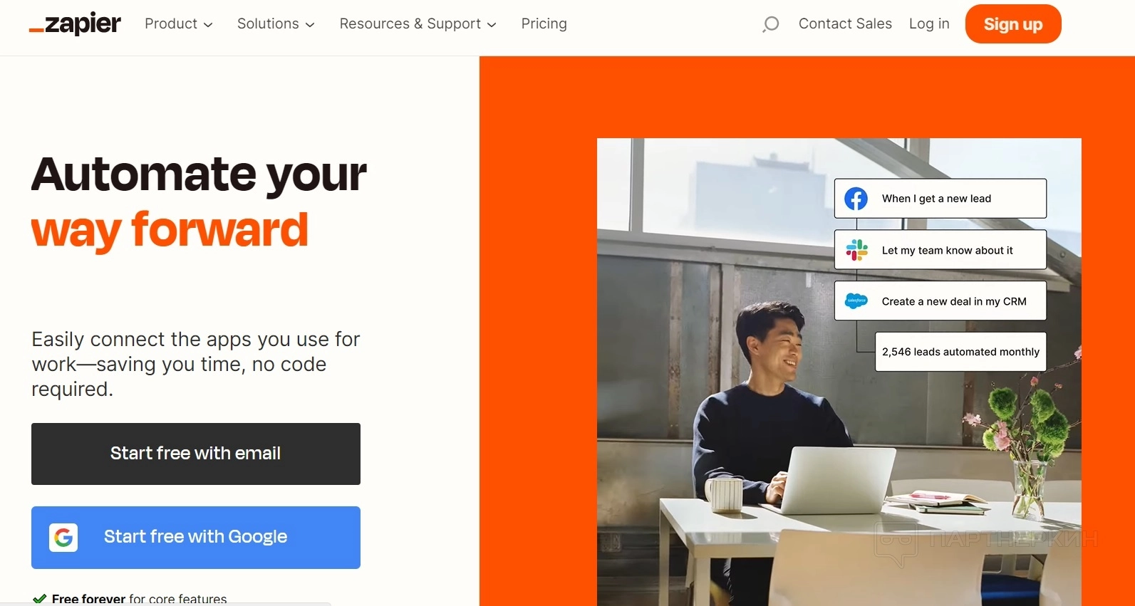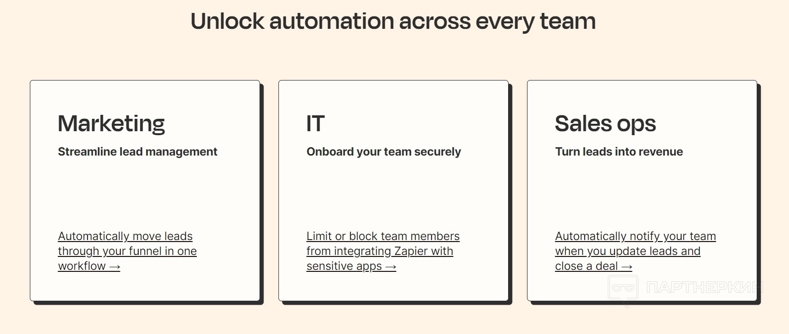 Zapierпомогает автоматизировать процессы в маркетинге и продажах, связывая инструменты, используемые для сбора лидов, отправки электронных писем, управления контактами. Это позволяет сократить время, затрачиваемое на рутинные задачи, улучшить координацию работы команды.