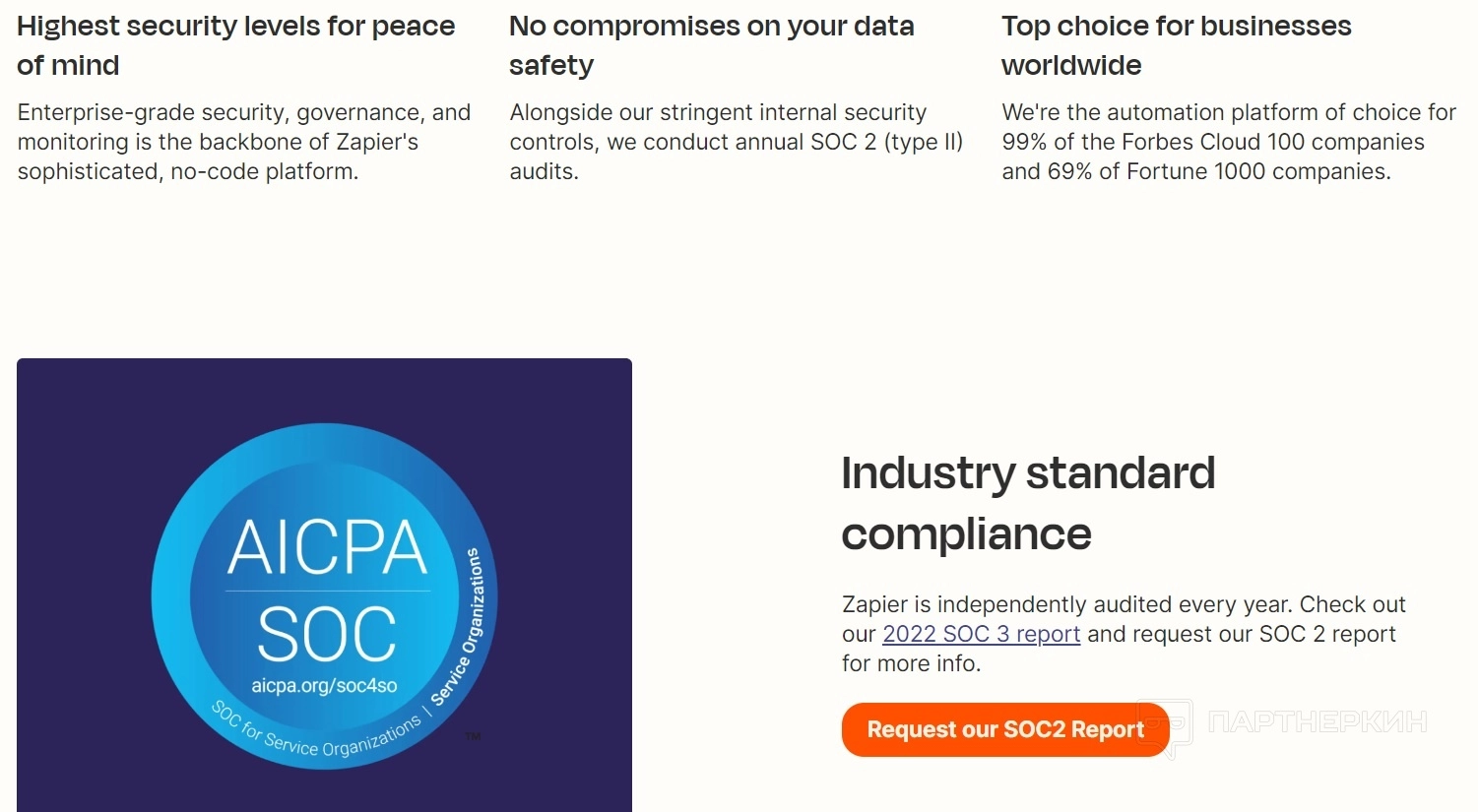 Zapierежегодно проходит независимый аудит. Есть возможность ознакомиться с отчетом SOC 3 за 2022 год или запросить отчет SOC 2 для получения дополнительной информации. Помимо 256-битного шифрования AES для безопасного хранения данных, Zapier обеспечивает безопасную сетевую связь с помощью TLS 1.2.