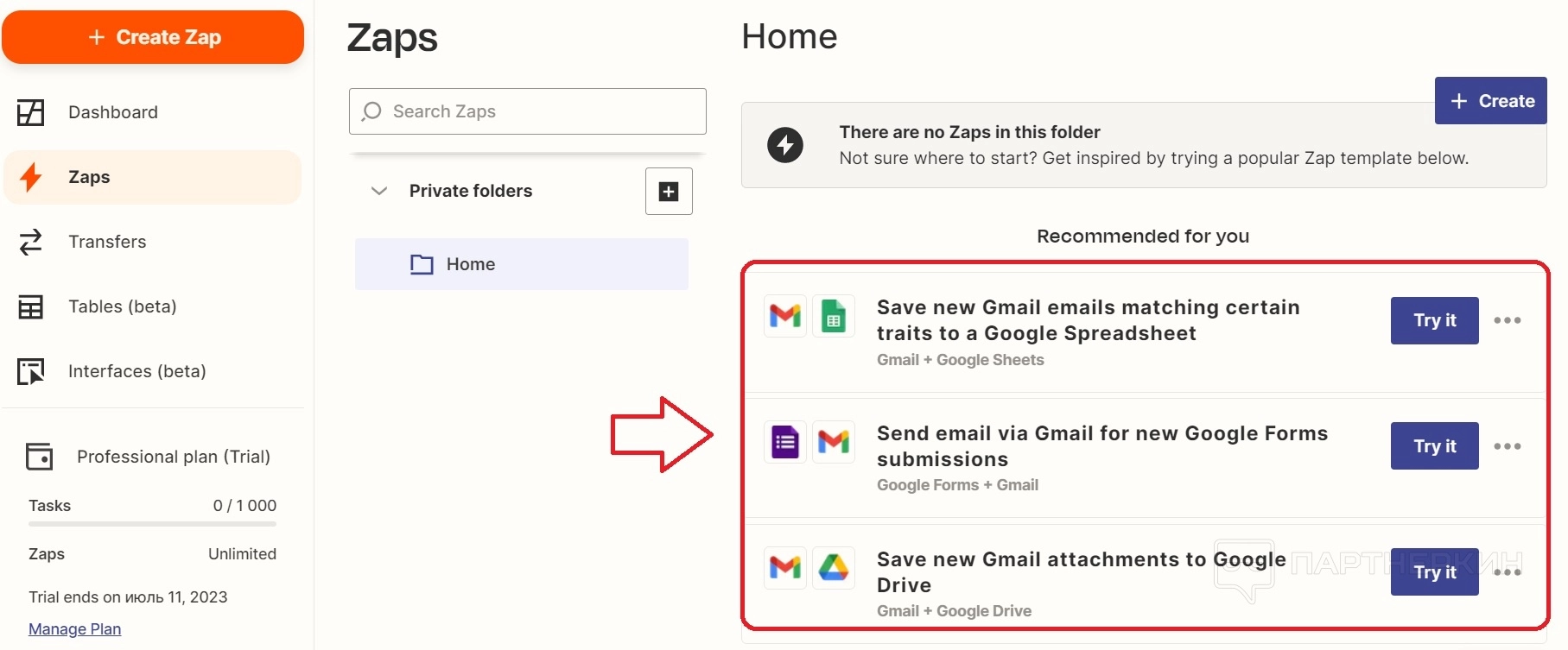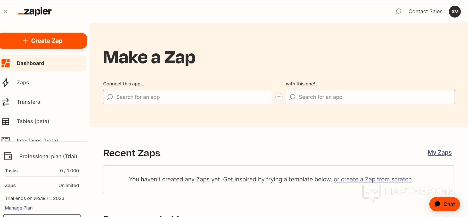 - Профессиональный — от $49 / мес. для 1 пользователя, до 2 000 задач/мес. и неограниченное количество и тип Zaps.