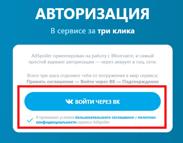 - Примите условия пользовательского соглашения и нажмите на кнопку «Войти через ВК».