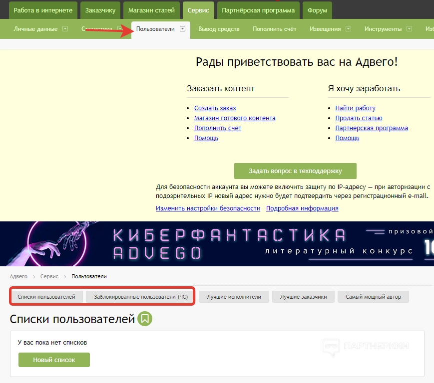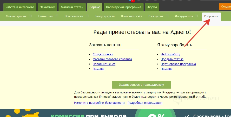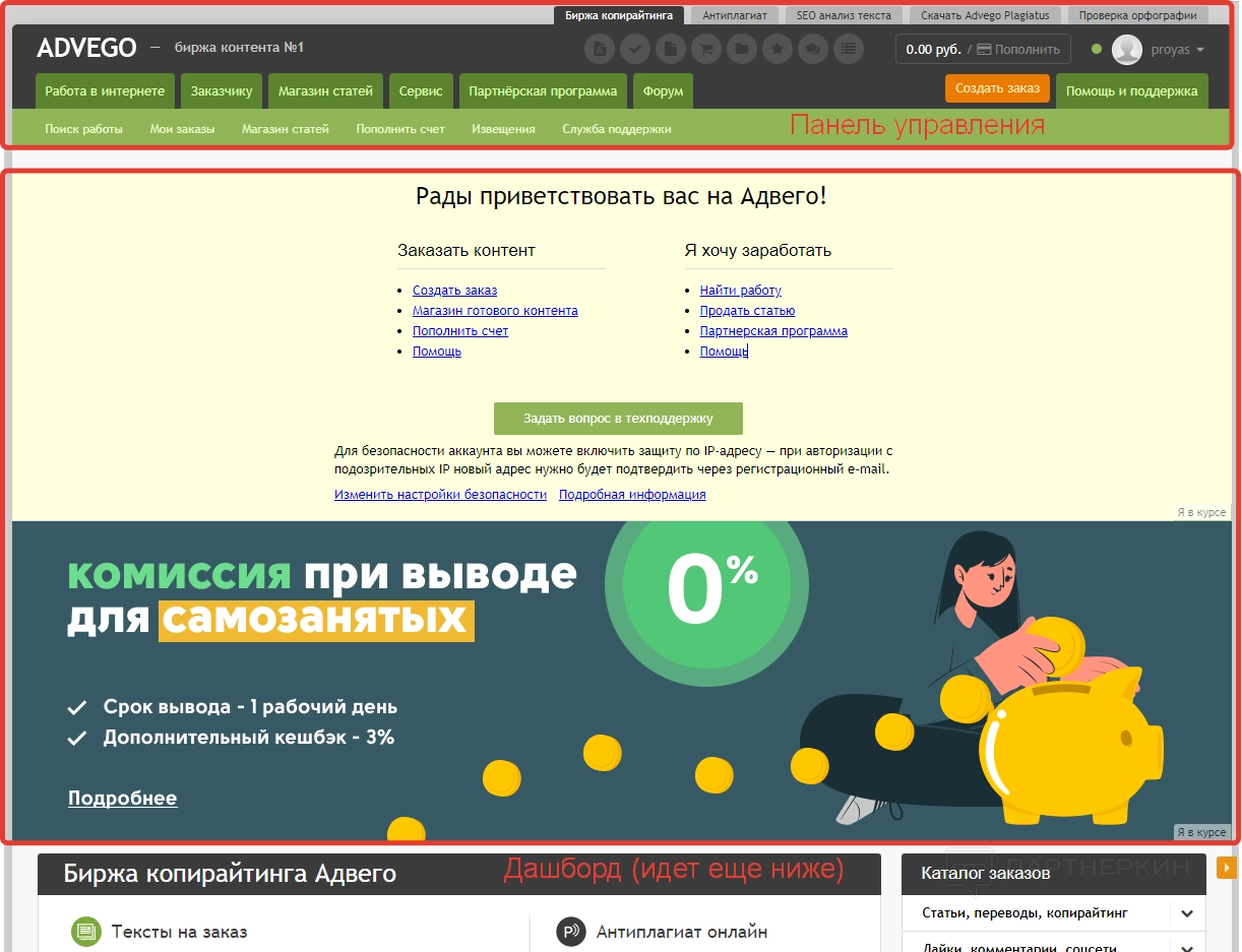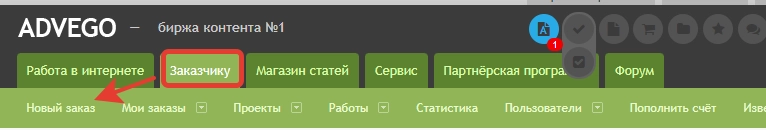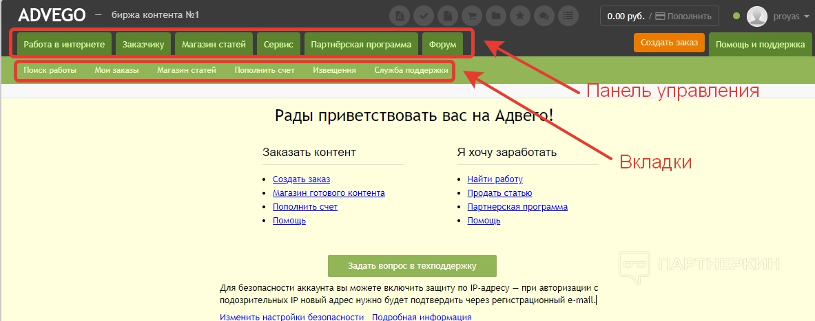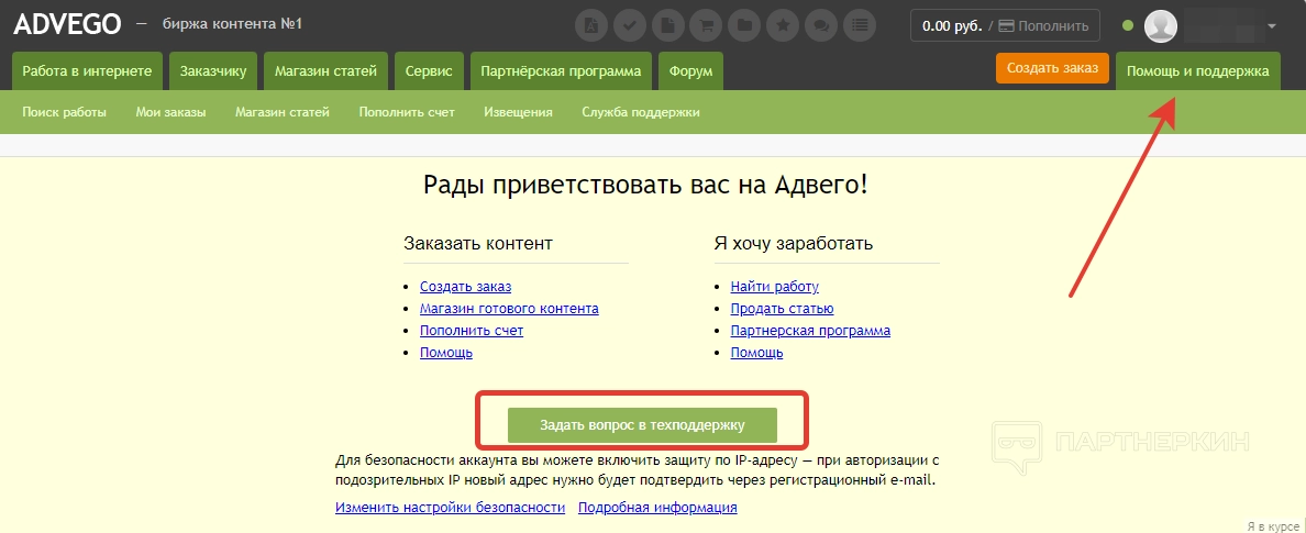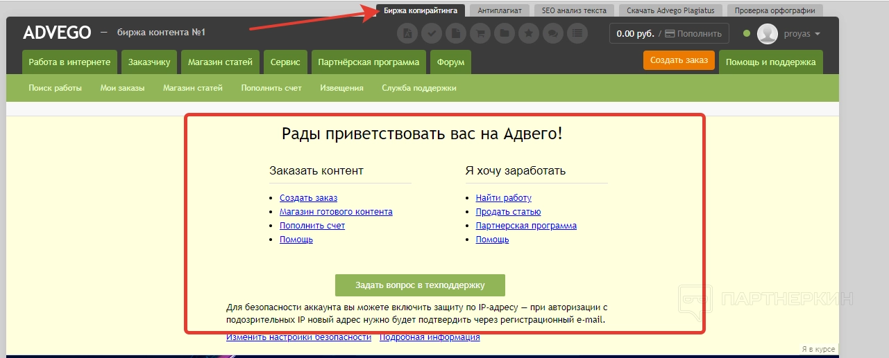 Раздел «Биржа копирайтинга» — это и есть стартовая страница личного кабинета, на которую попадет вебмастер после регистрации. В верхней части дашборда отображается навигатор по самым популярным разделам сервиса. Здесь же есть кнопка для отправки вопроса в службу техподдержки.