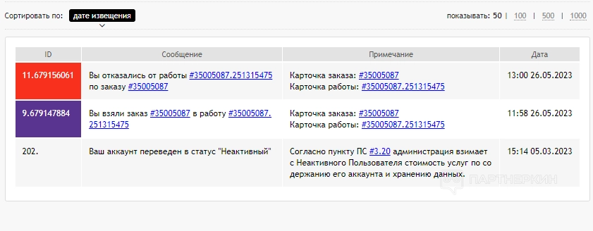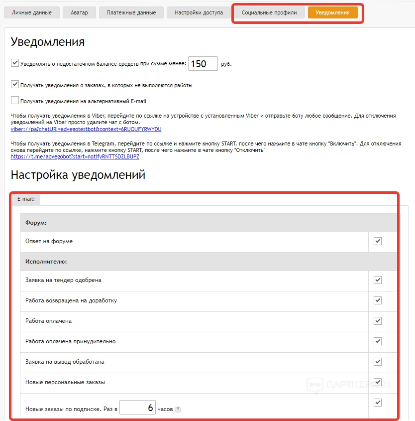 - извещения — в этой вкладке будут отображаться уведомления по привлеченным пользователям и их деятельности.