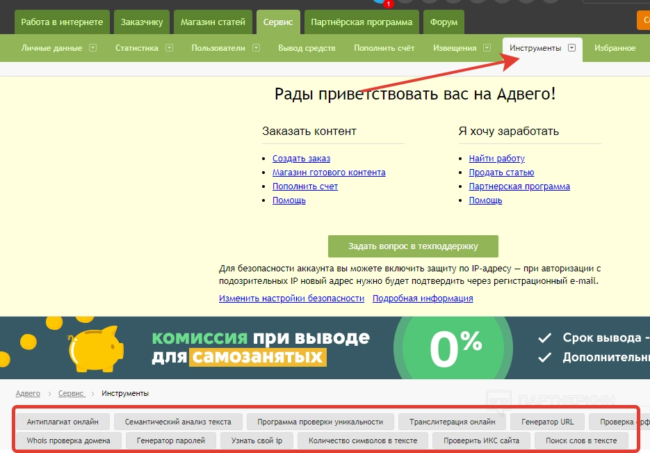 Ниже идет блок, представляющий каталог всех сервисом и инструментов Advego. Какие варианты здесь доступны: