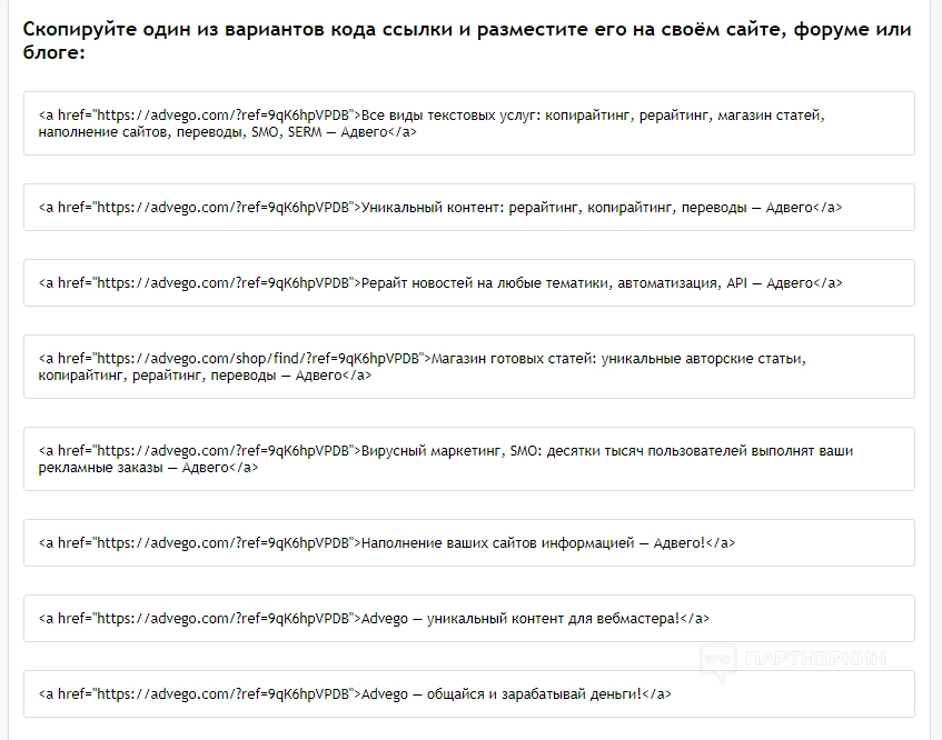 Примечательно, что партнерские ссылки можно размещать даже на своем сайте в виде отдельных блоков путем размещения специального кода.