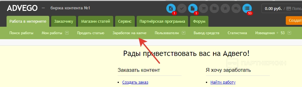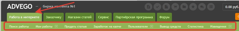 - Работа в Интернете . Основной раздел для исполнителей, где можно искать и выполнять различные заказы.