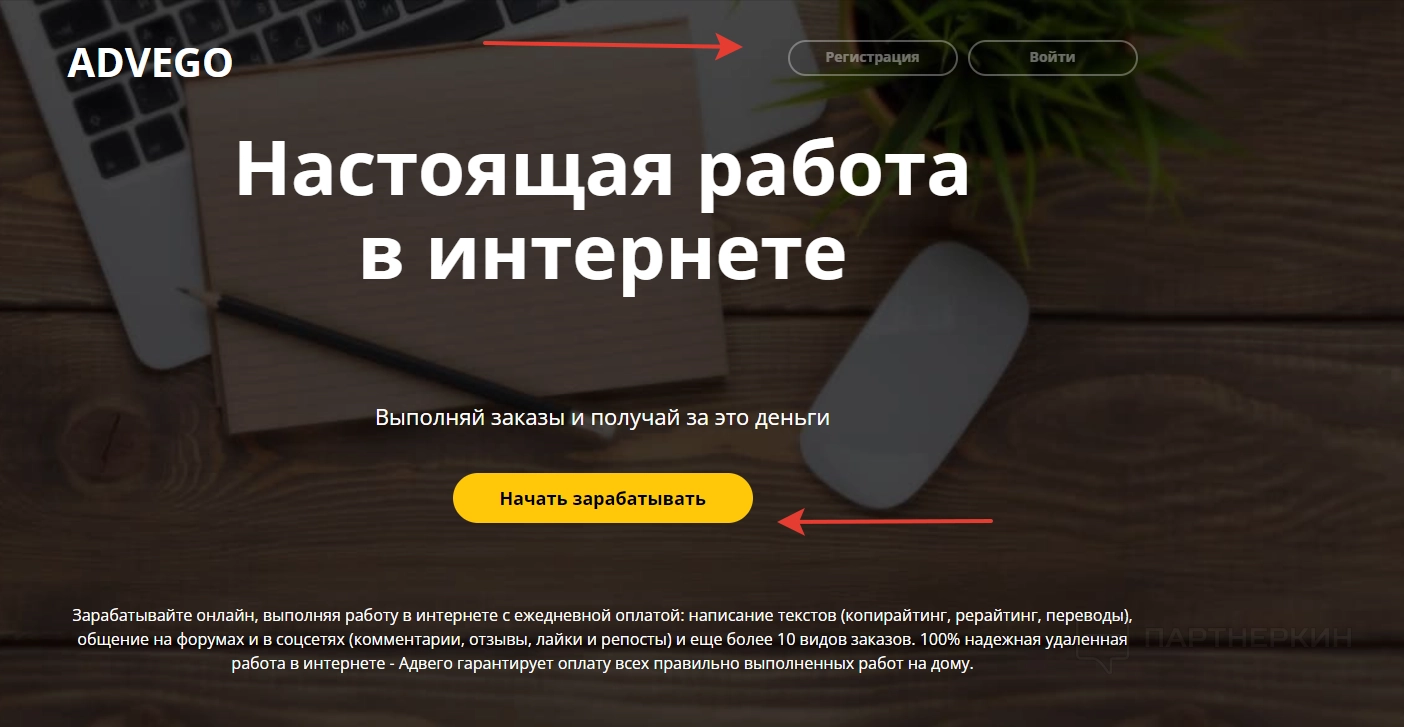 Чтобы создать учетную запись, заходим на главную страницу официального сайта и жмем на кнопки «Регистрация» или «Начать зарабатывать».