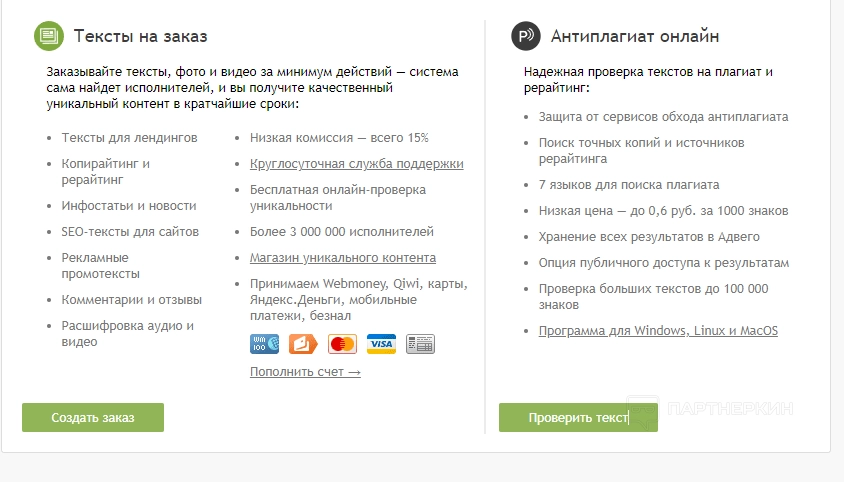 Далее идет блок со сводной информации об услугах, которые предлагает биржа. Здесь рассказано о том, какой контент можно заказывать и выполнять. Рядом же расписаны преимущества инструмента «Антиплагиат-онлайн».