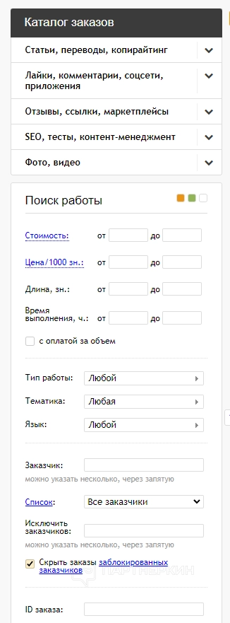 - поиск работы — каталог с заказами;