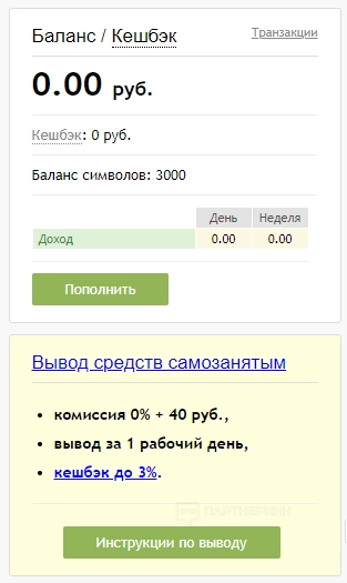 Под фильтром находится блок с балансом/кэшбэком и кнопка для пополнения счета. Еще ниже расписаны особенности и представлена инструкция по выводу средств самозанятым.