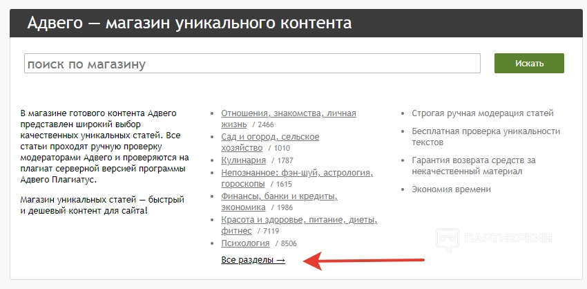 Далее идет блок со сводной информацией о магазине контента. Здесь отображаются не только преимущества маркета, но и представлены все тематики, в которых можно искать статьи.