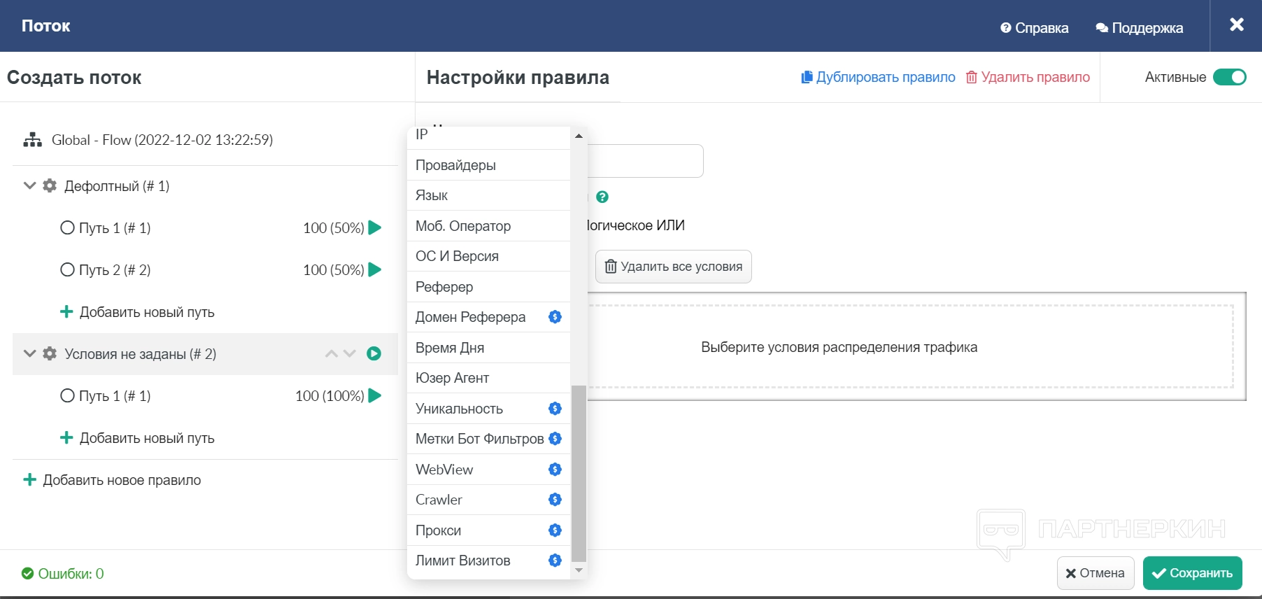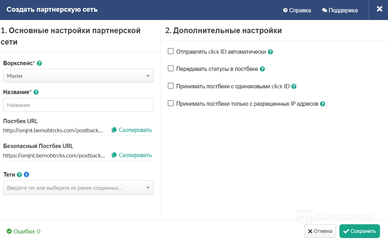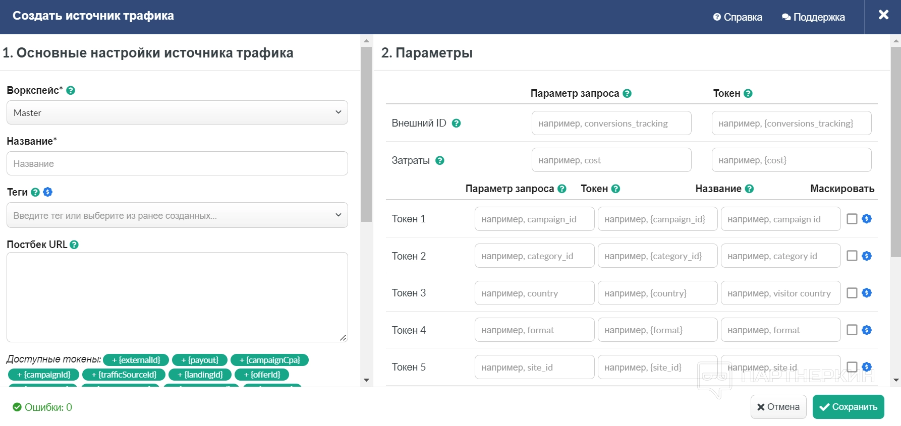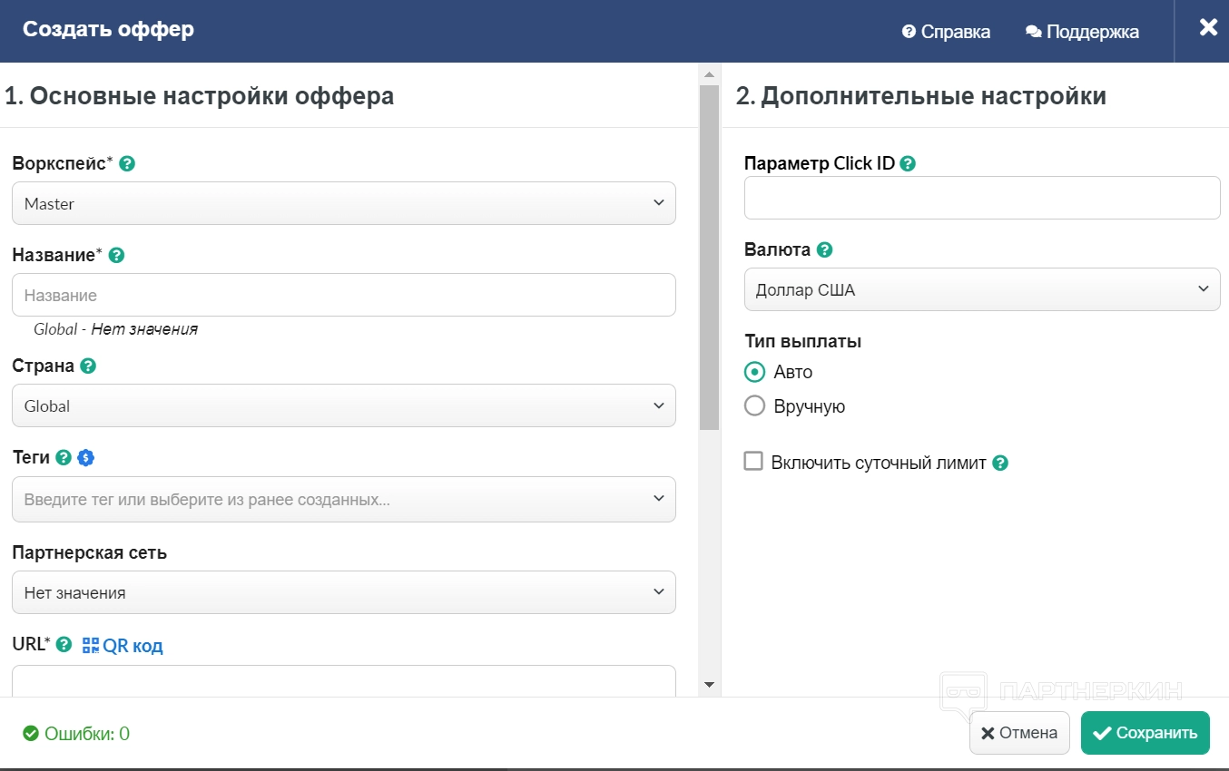 Вне зависимости от того, с какой именно партнерской сетью работает веб-мастер, он может самостоятельно настроить оффер с автоматической клоакой для источника трафика. При этом система моментально проверяет содержимое и в левом нижнем углу демонстрирует наличие и описание ошибок.