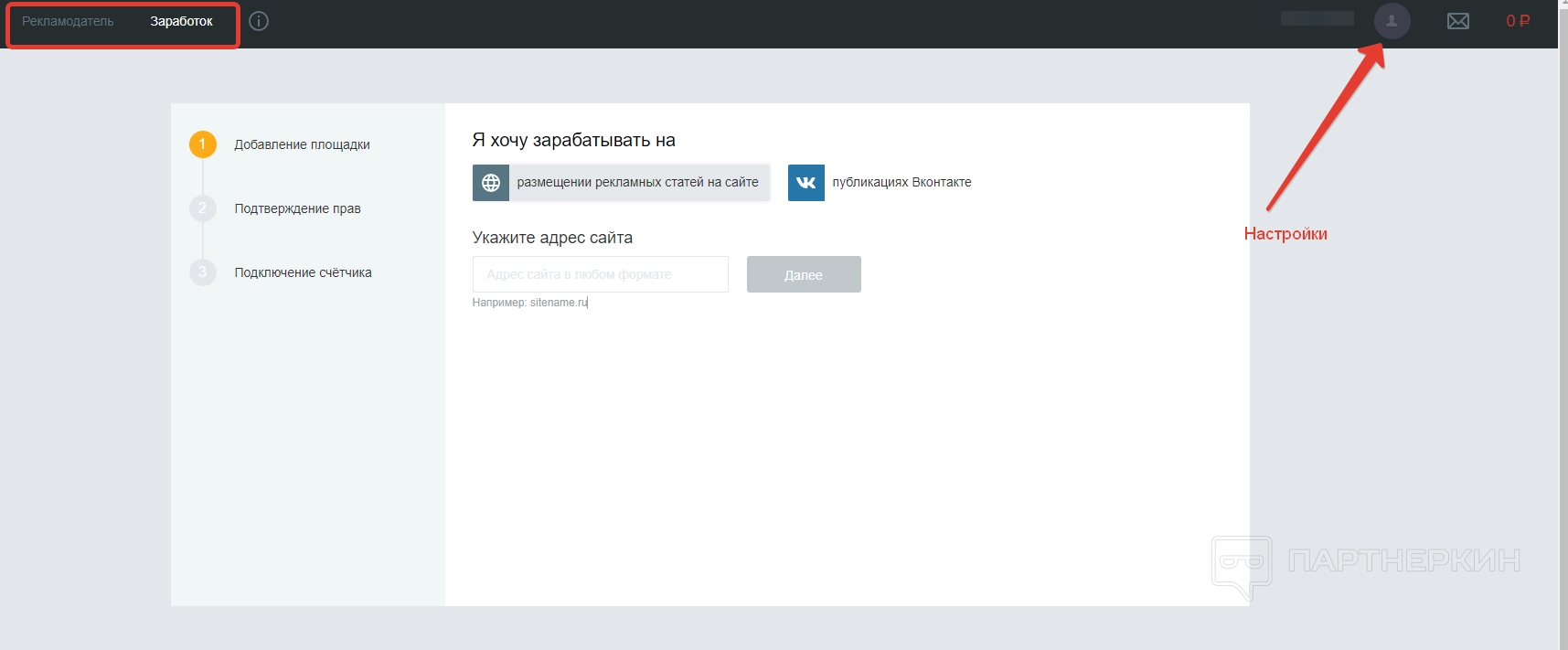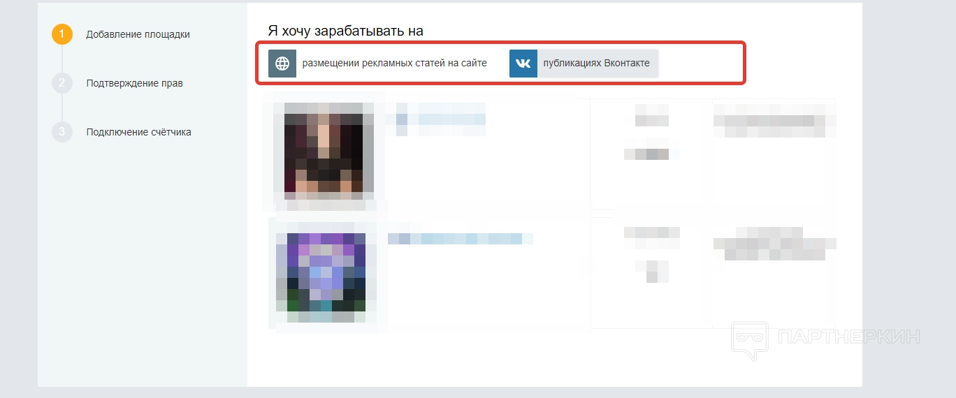 Принцип тот же, нужно снова настроить раздел. Для начала указываем способ заработка (размещение статей на сайте или публикации в ВК) и указываем ссылку на свою площадку.