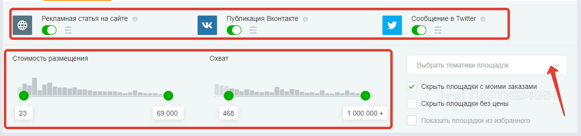 В конце откроется форма, где нужно откорректировать параметры продвижения. Для этого указываем площадки, с помощью ползунков регулируем стоимость размещения и охват, выбираем тематику площадок: