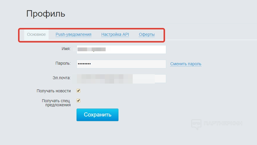 В разделе «Профиль» вебмастер может изменить пароль, настроить push-уведомления, получить API-ключ и разрешить системе присылать новости на указанную электронную почту.